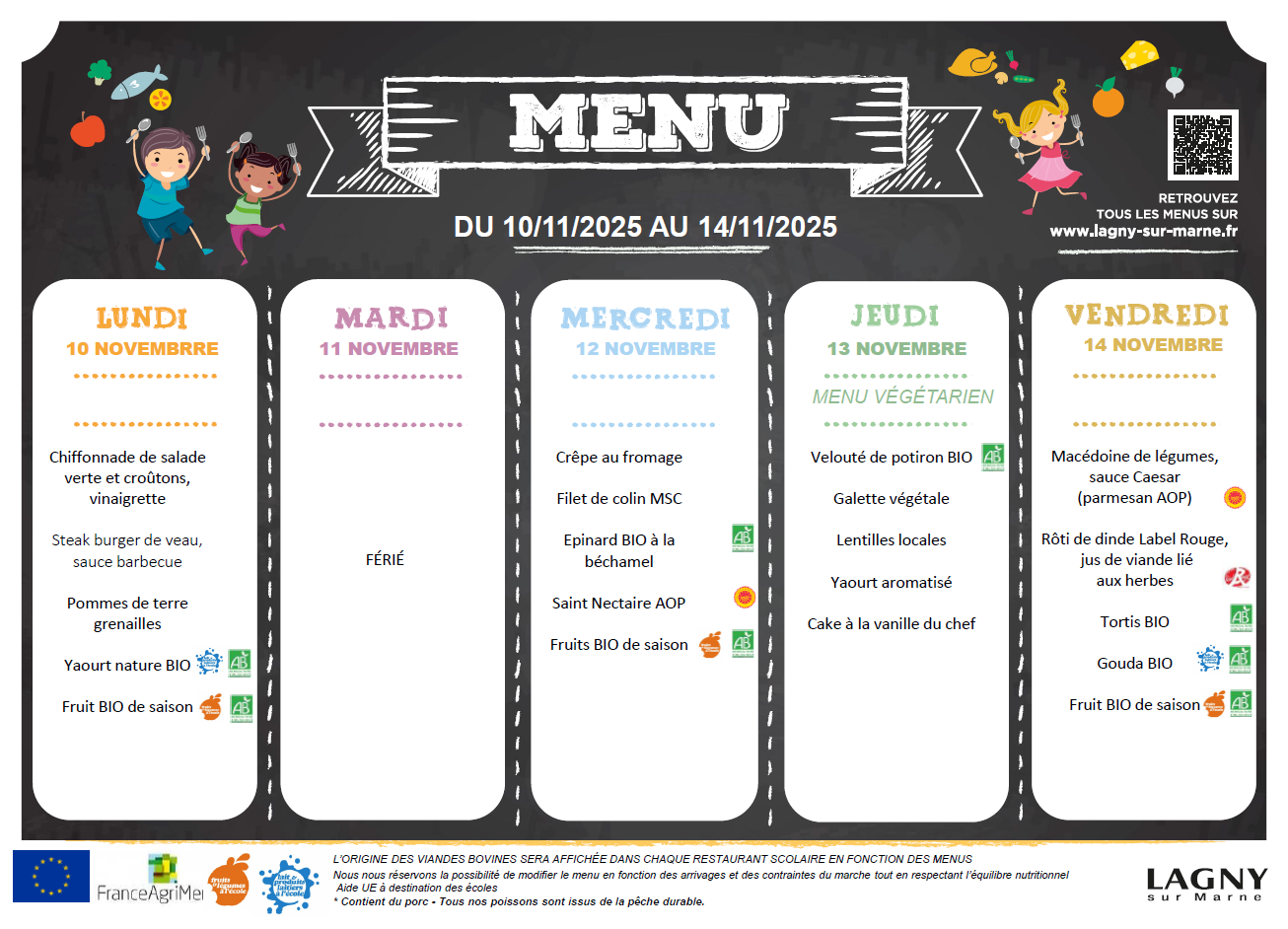 (L’origine des viandes bovines sera affichée dans chaque restaurant scolaire en fonction des menus.